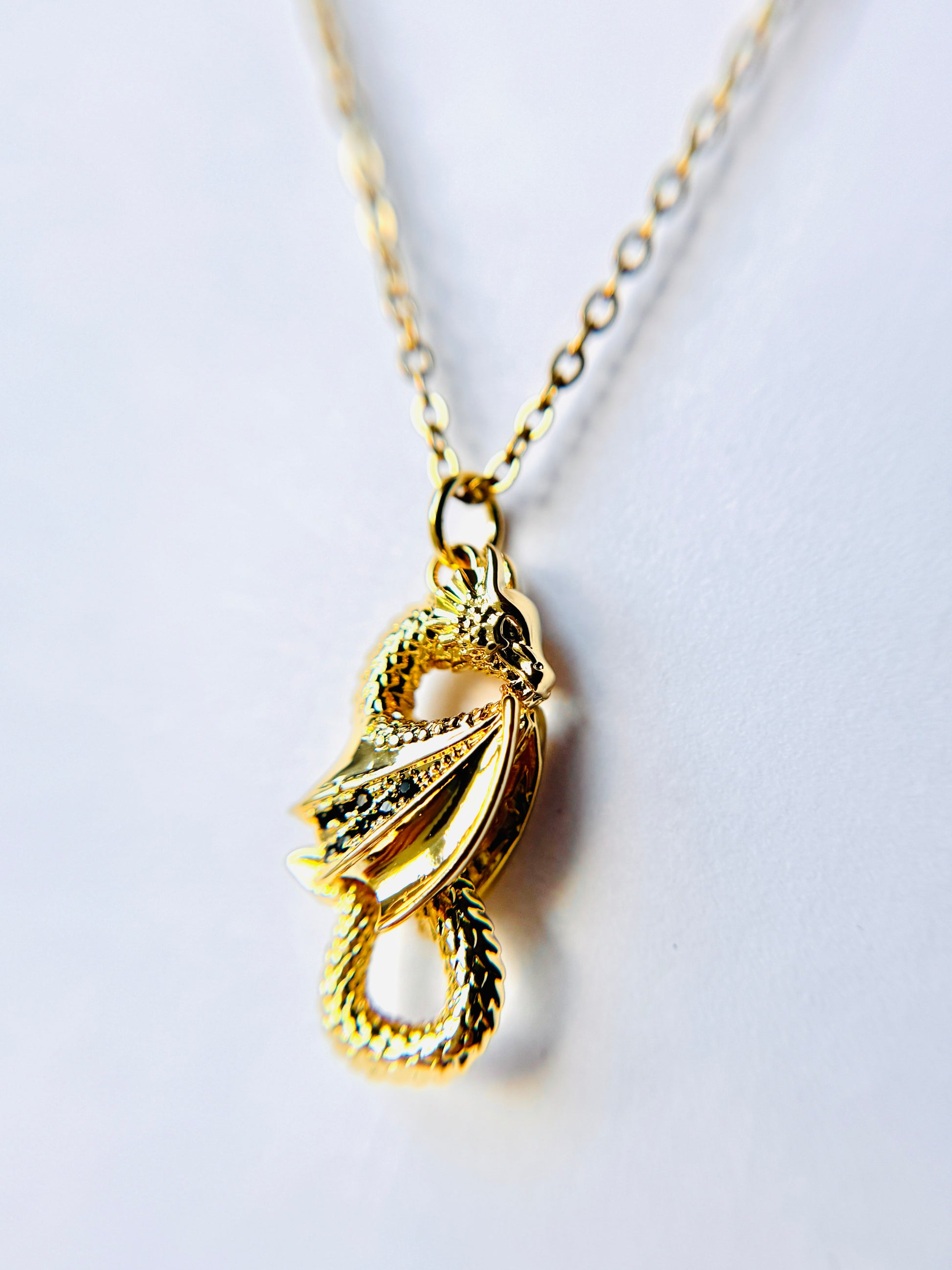 Introducing our stunning Gold Dragon Charm necklace. Made with intricate details and gold-plating, this unique piece is perfect for all dragon lovers, especially those who enjoy fantasy campaigns. With glittering black glass details on the wings, it adds a touch of mystery to any outfit. Own a piece of magic today with this handcrafted piece of jewelry.